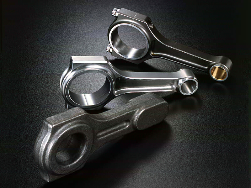 エンジン内部品でコンロッドは意外と軽視されやすい部品です。ところが最も重要な部品のひとつでもあります。近年のターボエンジンの高出力は驚くものがあり、まさに純正のコンロッドでは対応できなくなってきています。又、NAエンジンで最大の魅力である高レスポンス、これはコンロッド重量が大きく影響しています。この他に重量位置の同一性による全体バランス、大端部回り重量の低減によるクランクメタルの負担低減等、コンロッドに求められる性能は本来多数存在します。