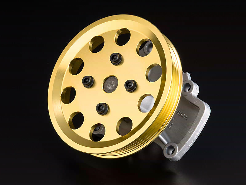 エンジンのパワーUPに伴い、発熱量は当然増えます。特にサーキット走行などではオーバーヒートを起こしやすくなります。JUNではGT選手権で得たノウハウをもとに大容ウォーターポンプを開発しました。これにより冷却効率を高めます。