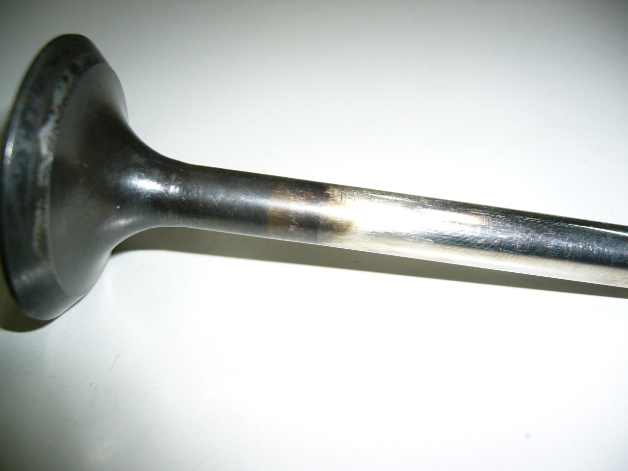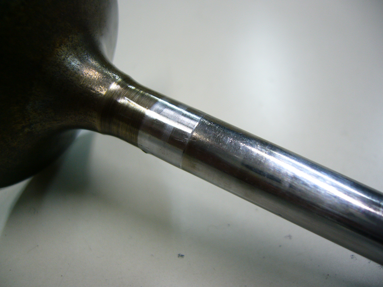 画像は全般で減り、段差ができているバルブです(ツメでひっかかります)。丁度バルブガイドの燃焼室側の端と接触する部分になります。