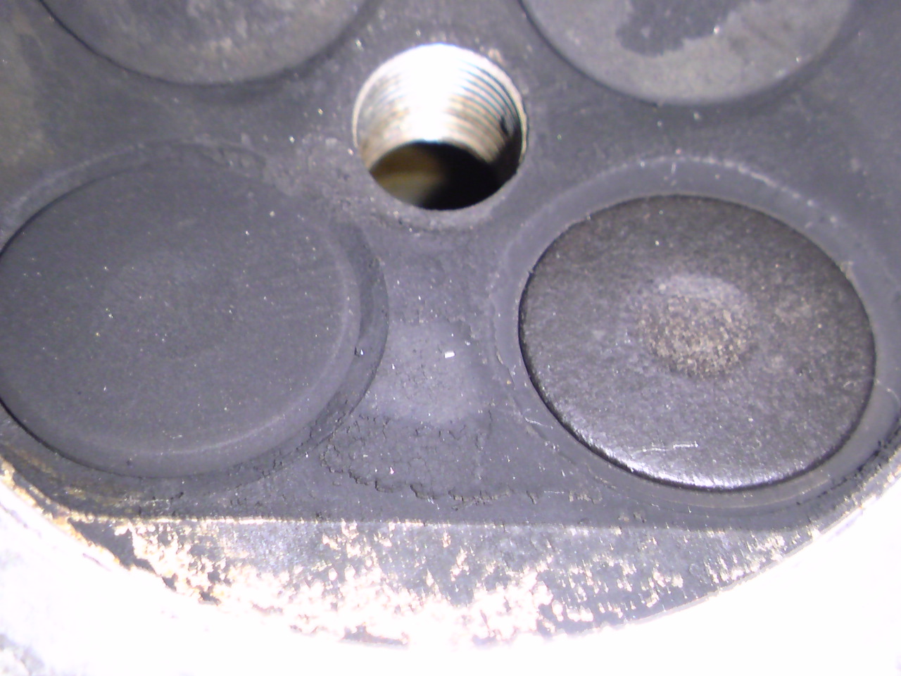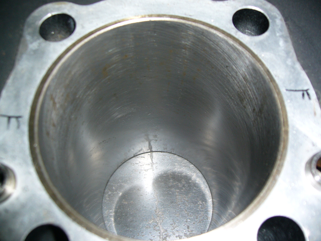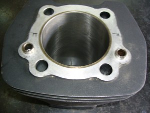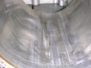 画像中央の白くなっている部分がありますが、ここ多分ピストンのアルミが焼きついてしまってます。この裏側が結構な確率で抉れている事が多く、他は0.25オーバーサイズでも問題ないかと思うのですが一番当るところにキズが残る可能性がある恐れがありましたので、今回はあえて2サイズオーバーでのボーリング加工を提案させて頂きました。
