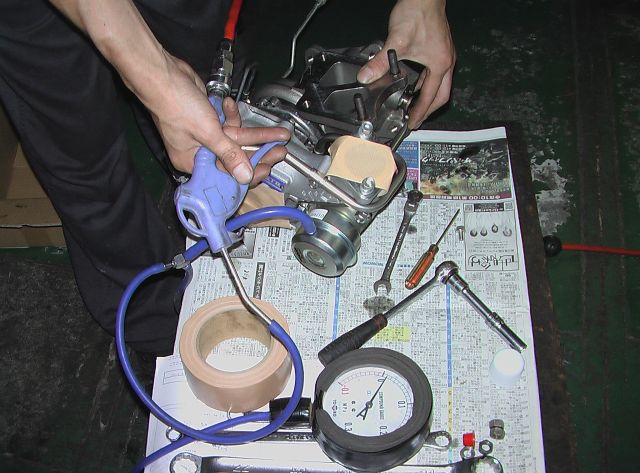 精度の高い圧力計を接続して、エア圧をかけながらアクチュエータの作動圧を確認しています。