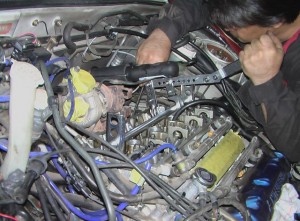 写真はV6横置きのリア側のヘッドでの作業風景です。
