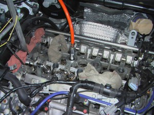 プラグの穴からエア圧をかけて、バルブが下がらないようにしておいてからバルブリテーナーを外してスプリングを交換します。