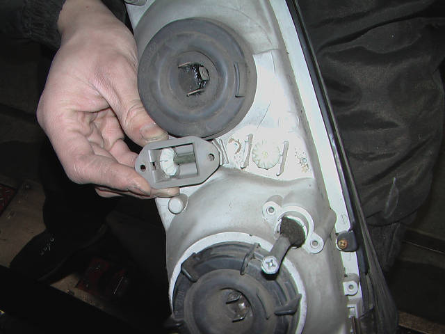 車両はZ32です。ヘッドライト裏にあるアジャスターを取り外したところ。