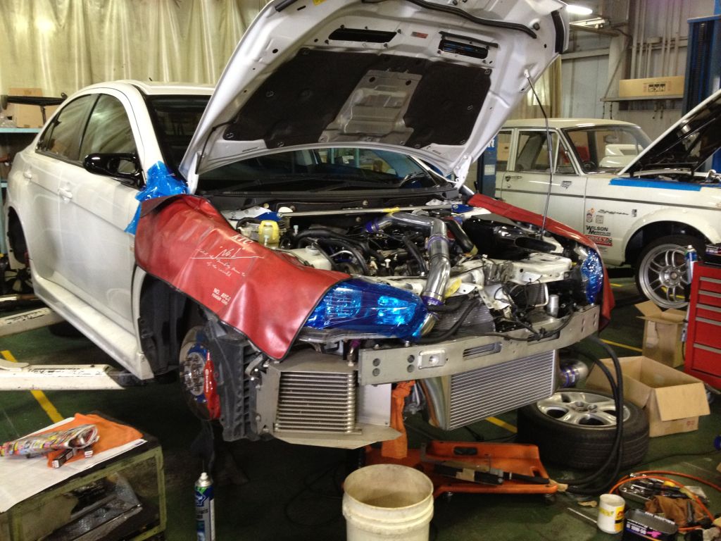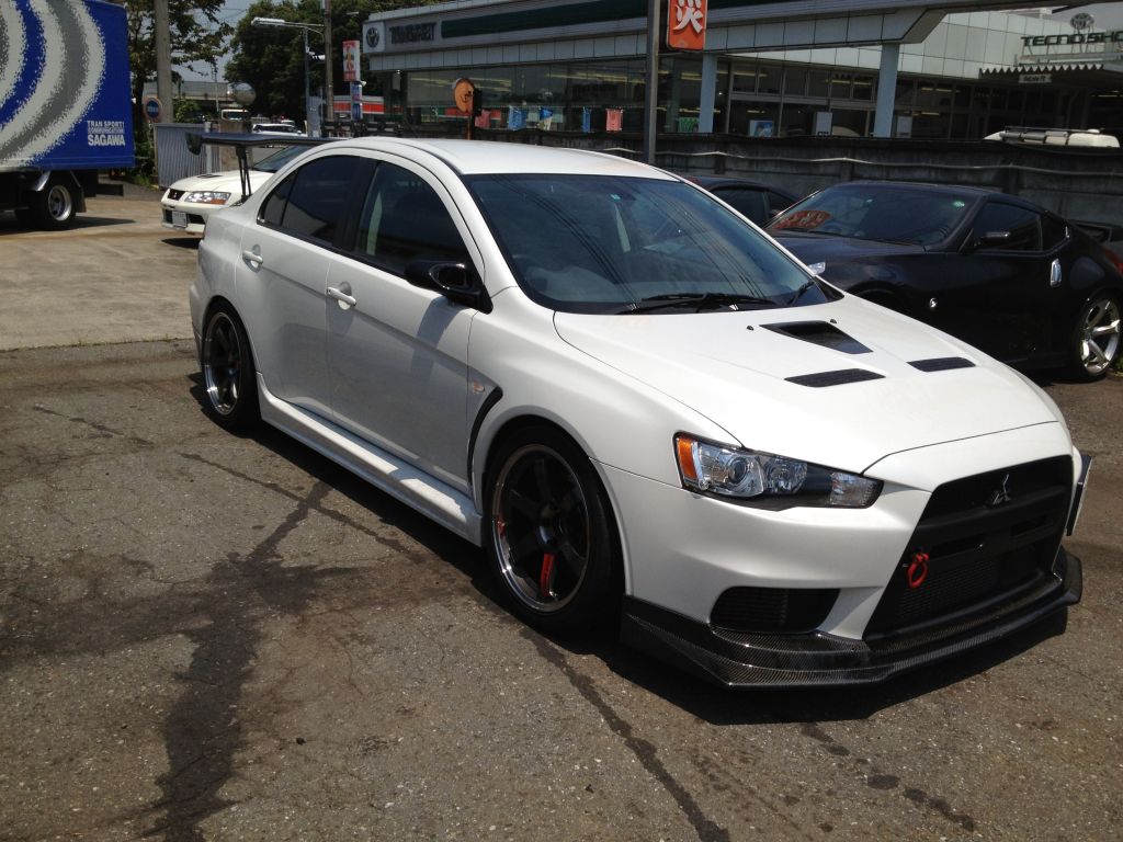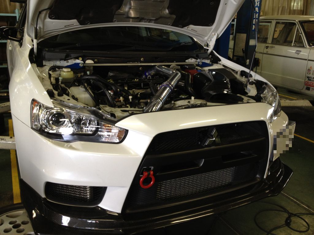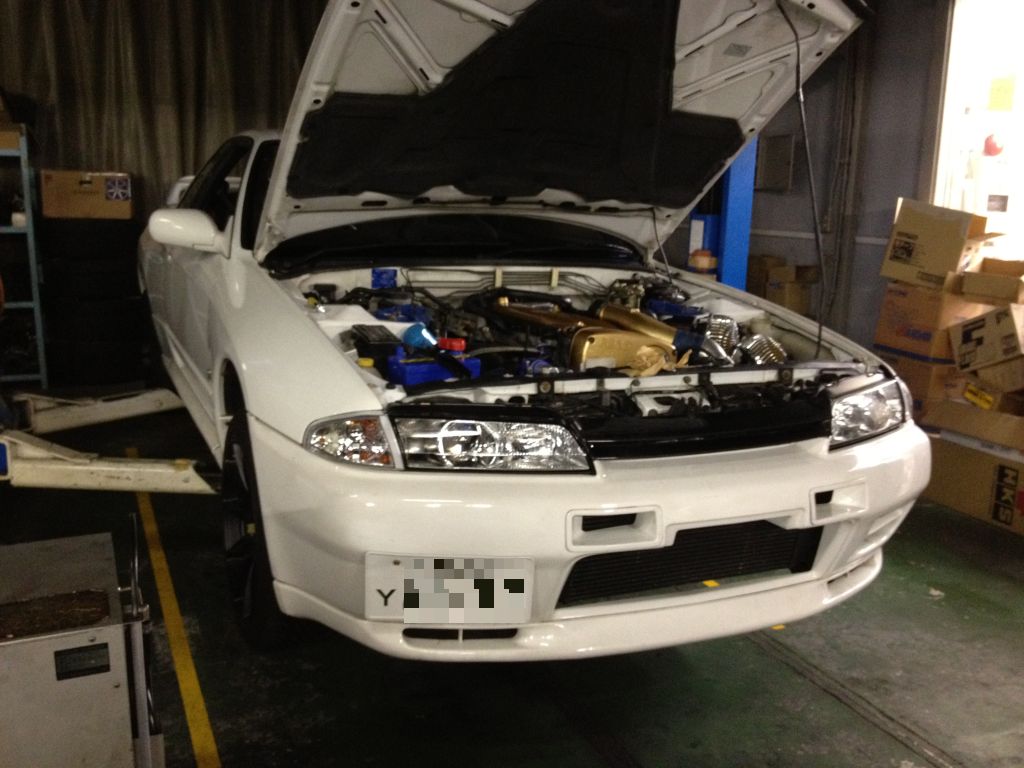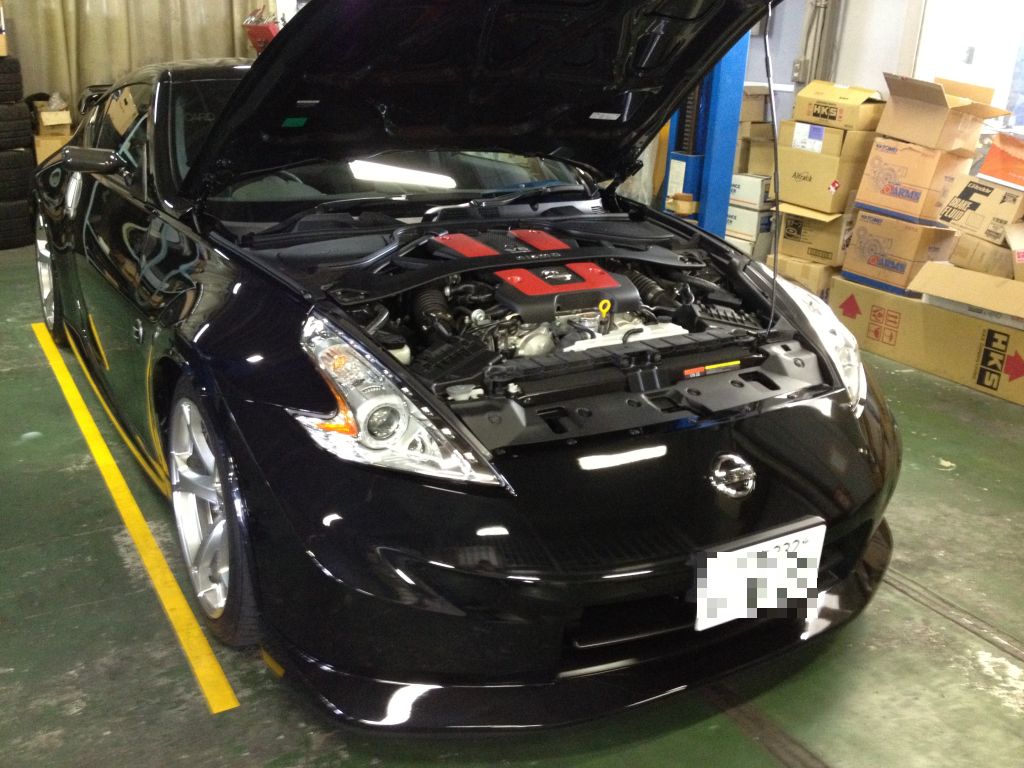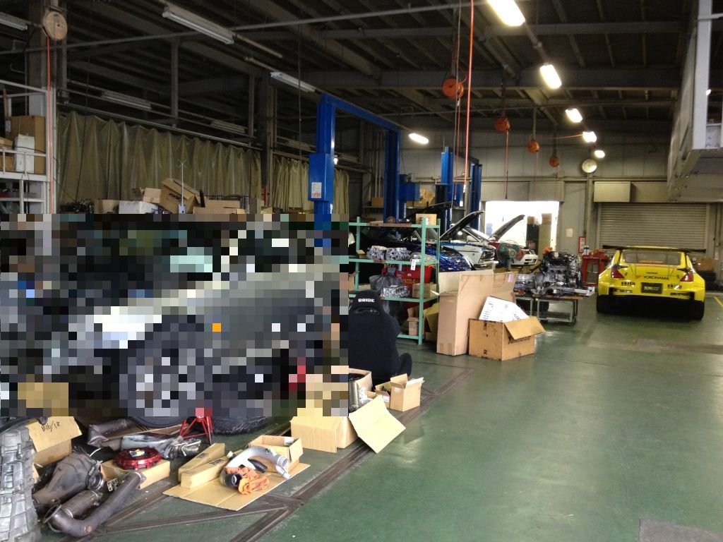 奥の方に見える黄色いZ33は、香港からしばらく里帰りしていました。エンジン不調を直せなくて、何年も放置になっていたのを、当社に運んできてエンジン点検修理、セッティングやり直しで完調になりました^^。エビスサーキットに持って行って試運転したのですが、エンジン絶好調でした。3.8Lでツインターボなので、どっから踏んでも鬼のように加速しますw。ショックも抜けているようで、暴れまわって私の手にはおえませんでしたw。