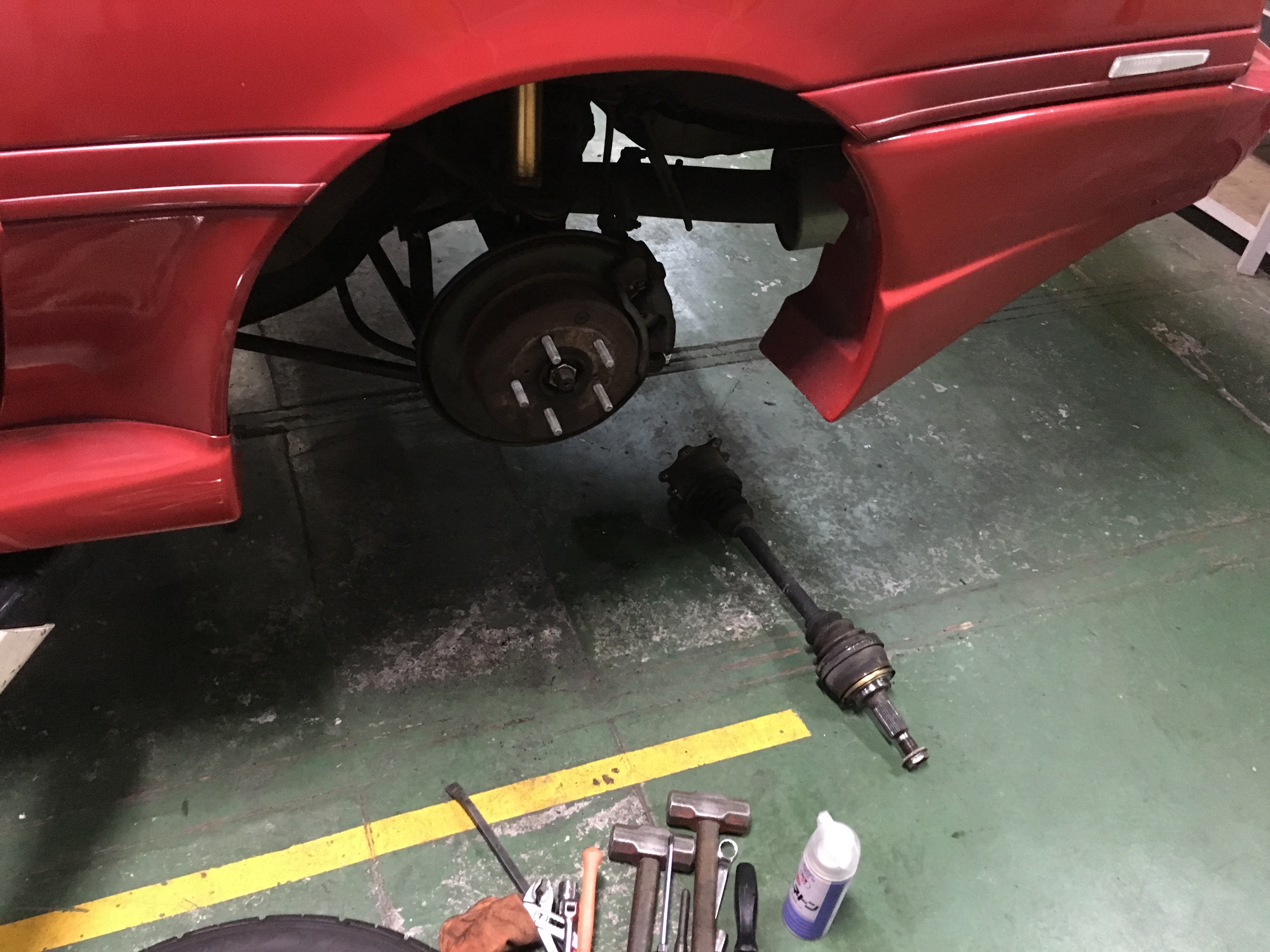 さすがに古いので、新品は製廃、リビルトは対応できないとの事で(~_~;)。中古のドライブシャフトを探しました。MZ20ソアラの部品が同品番でした。中古なので安くていいのですが、どれくらい持つのかなんともいえません(~_~;)。古いお車なので、錆で固着したりしていててこずりました。写真のでかいハンマーが格闘振りを物語っていますw。