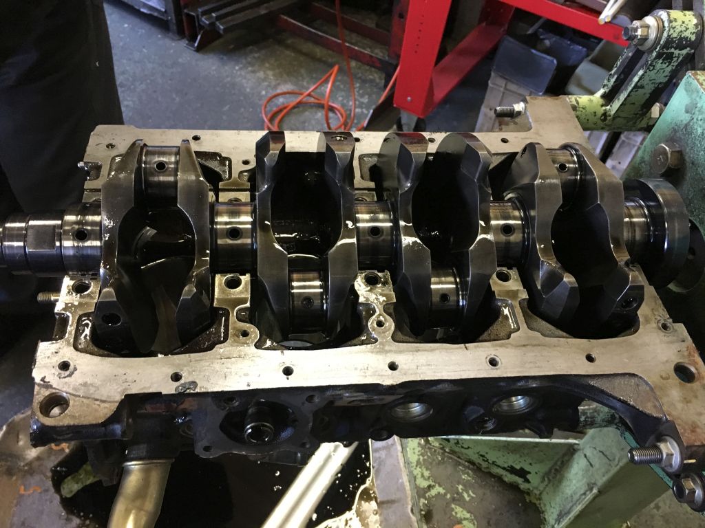 クランクキャップが一体式のためエンジンスタンドから一旦外して、測定します。こうしないと真ん中以降の4番目、5番目にボアゲージが届きません(^_^;)