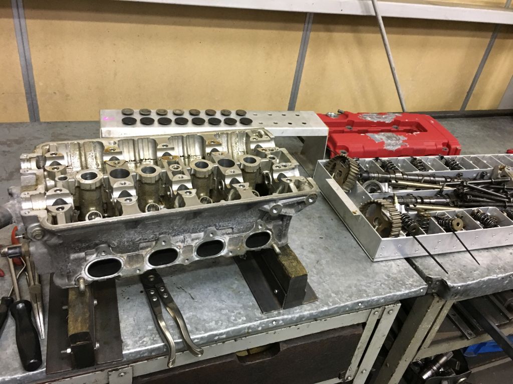 赤いカムカバーも黄色と緑に塗り分けてコンプリートにします。今は本社でボーリング、ホーニングやヘッドのバルブ研磨、シートカットなどやっています(^。^)。その横では別のメカニックがEJ25エンジン分解していたり。エンジン室は更にギチギチに(^_^;)。