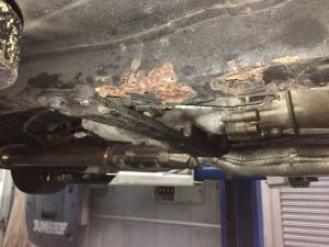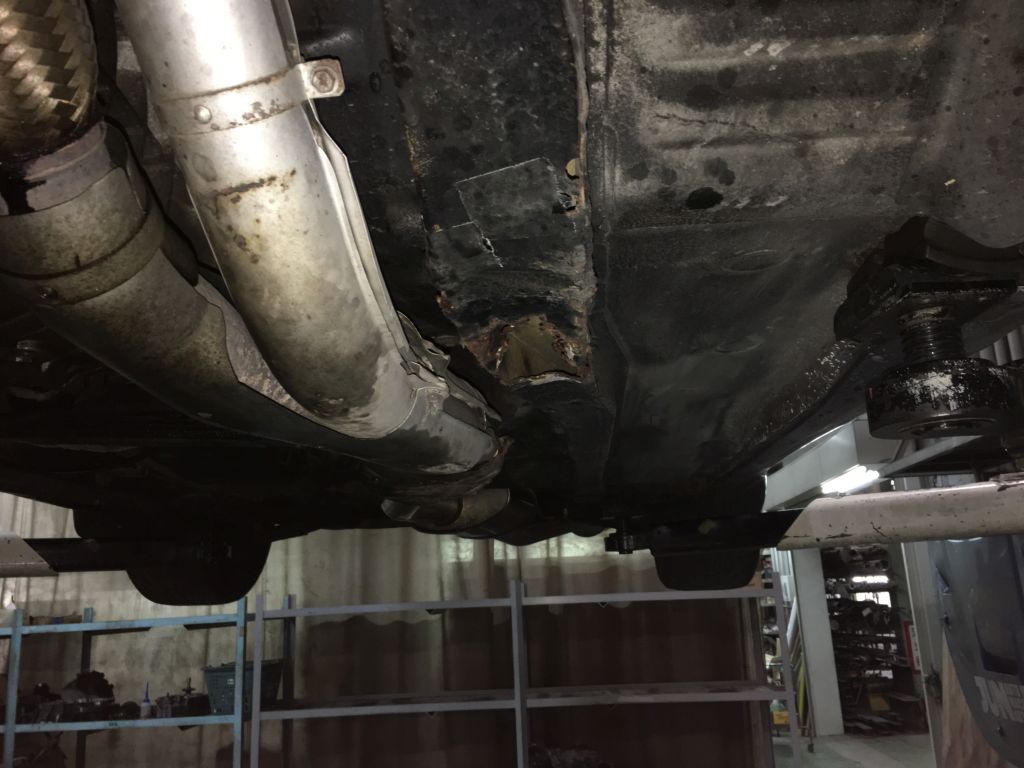 持ち上げて見ると、色々と・・・・。サイドシルの前側ジャッキポイントが潰れて腐っているのはお約束ですが、メインのフレームまでボロボロです、指がズブズブっと入っていきそうです(^_^;)。