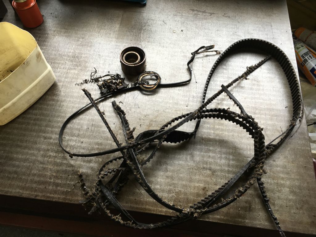 良く見ると、ベルトテンショナーが壊れて、タイミングベルトを切ってしまったようです。このエンジンはベルトが切れてもバルブがグチャグチャにはならないようですが、少しピストンと当たって曲がっています。