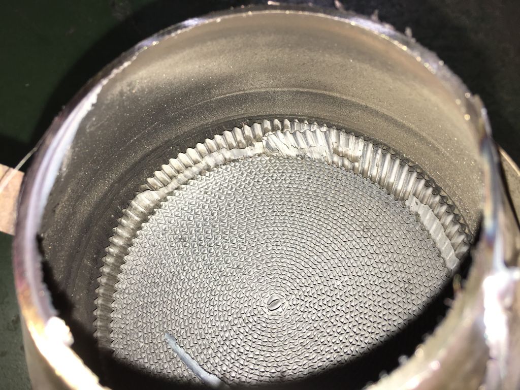 先日パワー出ないGRFを記事にしましたが、バルタイに問題なくて触媒を点検して見ました。SUBARUの触媒は、セルの前後のパイプが曲がっているので直接は見えません。しかし、少しだけ見える端の方がおかしなことになっていたので、お客様の了解を頂いて、切ってみました。