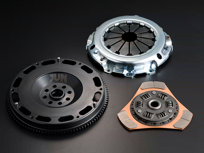 JUNのクラッチキットはフライホイールまでを同梱し、駆動系パーツを一気に強化することが可能です。これまでにも好評なクロモリ製軽量フライホイールに加え、新たにラインナップしたシングル仕様のディスクとカバーは、それぞれ軽量ながらも様々なレースシーンで十分な性能を発揮する強度を持っています。