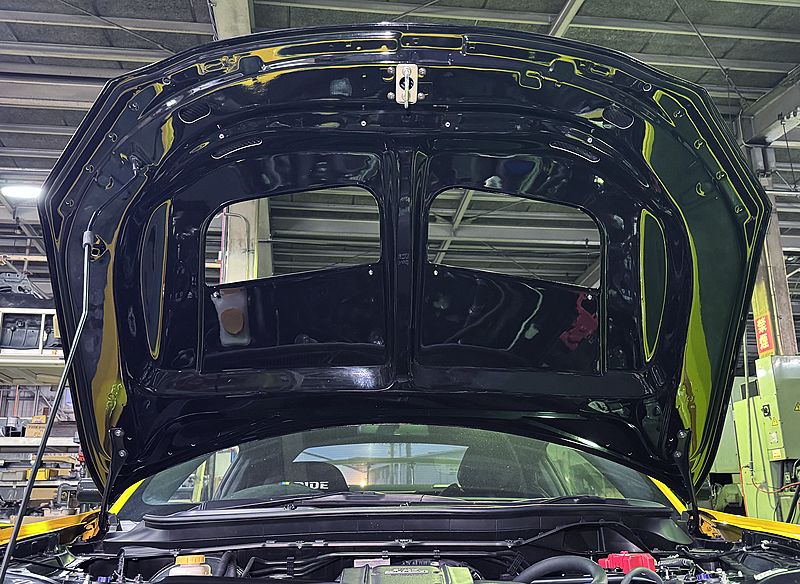 This product is made of wet carbon fiber and has the same shape as the genuine part. The outer and even the inner panels are made of CFRP, making it extremely lightweight, more than 3kg lighter than the factory hood (approx. 8.6kg).
