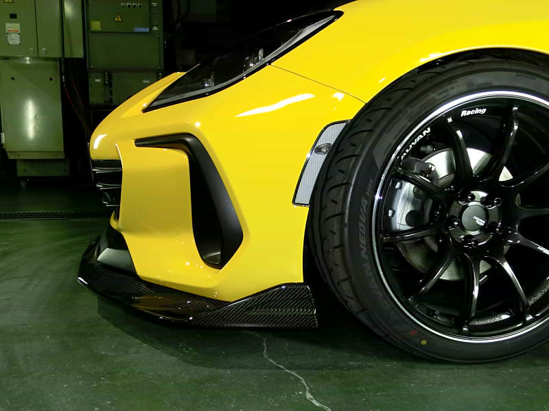 This product is installed under the factory front bumper. The lip shape protrudes from the front of the bumper to increase the flat ground clearance and provide more downforce. Also, the canards effect improves the ground contact of the front tires in corners.