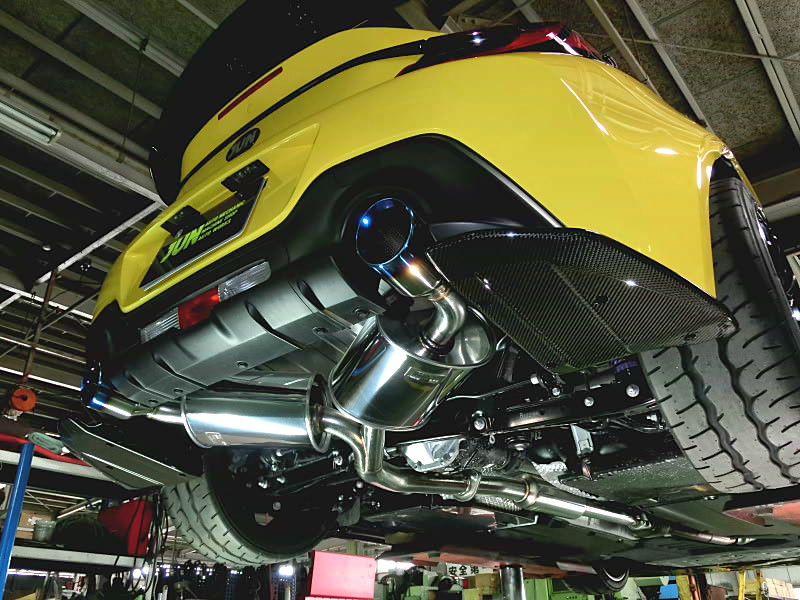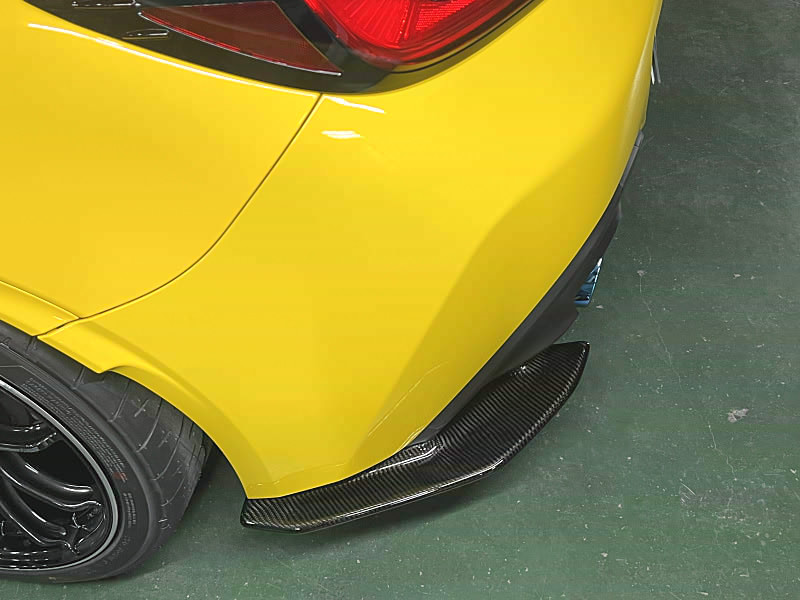This diffuser is installed under both sides of the stock rear bumper. This diffuser suppresses turbulence behind the tires, and the rectification plates on the left and right sides allow air to flow smoothly backward.
