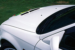 前方中央に大型のエアアウトレットを設けることでエンジンルーム内の熱気を効率よく排出し、エンジンルームの冷却効率アップに貢献します。FRP素材の使用でフロントヘビーなFF車の軽量化にも役立ちます。また、ボンネットピンと純正キャッチを併用するタイプで、フロント側をこの3点で支持する事により高速走行時のボンネットの浮き上がりやバタツキを押さえる事が可能です。