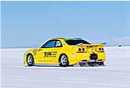 1マイル過ぎで3速9000rpmを越える。車体挙動はひっぱているせいか、更にタイヤが滑ってコントロールが利かない。9500rpmまで何とかひっぱり4速へシフトUPした瞬間、ブーストの立ち上がりでリヤタイヤコントロール不能、スピンアウトしてしまう。スピン時、時速約340km/h。回転したときトランクが開いたため浮き上がらずにすんだものの、トランクが開かなかったら、そのまま宙へ飛んでしまったか???。まさに不幸中の幸いとなった。しかし1マイルで200MPHは越えていただけに非常に悔しい。