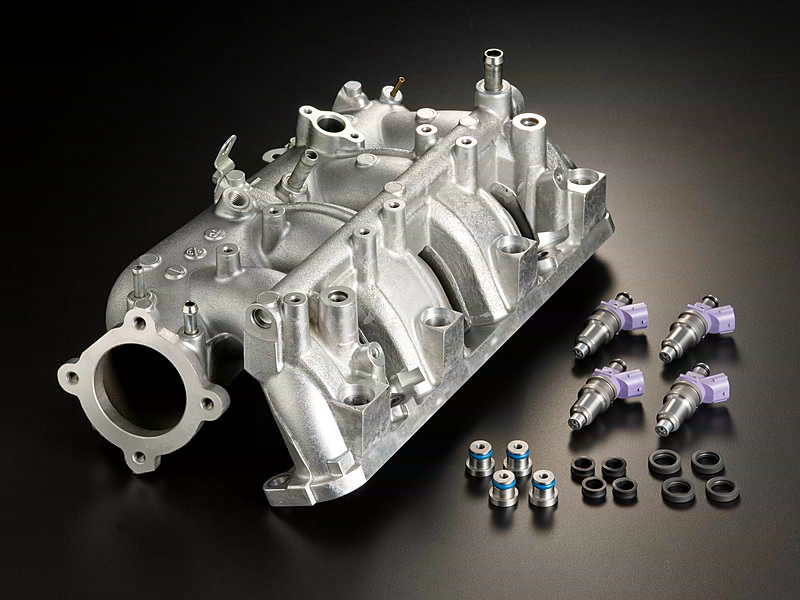 高出力エンジンを造るために必要な大容量インジェクターを取り付けるための加工を施したインテークマニホールドです。社外インジェクターを取り付けるために必要な部品が含まれます。インジェクターは SARD製 650cc/800cc及び1000ccに対応しています。またフューエルデリバリーパイプは純正品がそのままご利用になれます。